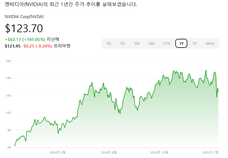 엔비디아(NVIDIA)는 최근 1년 동안 주가가 크게 상승했습니다. 2024년 한 해 동안 엔비디아의 주가는 약 171% 상승했습니다.